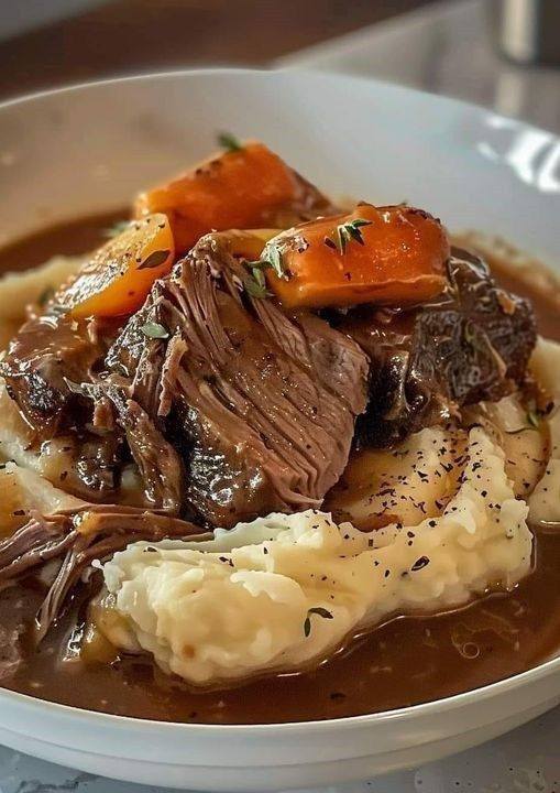A tender, slow-cooked pot roast served over velvety mashed potatoes is the epitome of comfort food. This hearty dish features succulent beef braised in a rich, savory broth with carrots and potatoes, all spooned over buttery mashed potatoes for the ultimate satisfying meal.