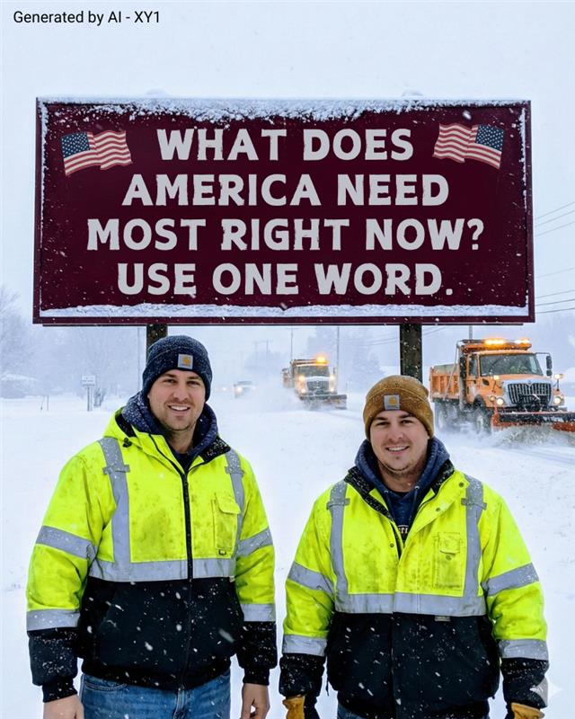 The image features a snowy landscape with two individuals dressed in bright yellow jackets standing in front of a large billboard. The billboard asks a thought-provoking question: “What does America need most right now? Use one word.”