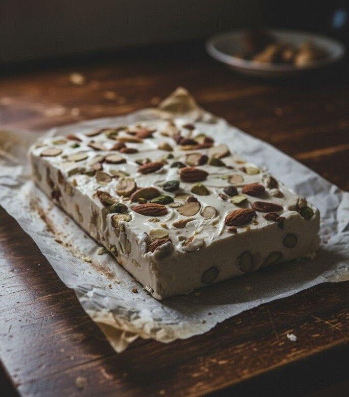 • Ethereal Texture: Whipped egg whites are folded into the hot syrup, giving the nougat its signature light and airy consistency.