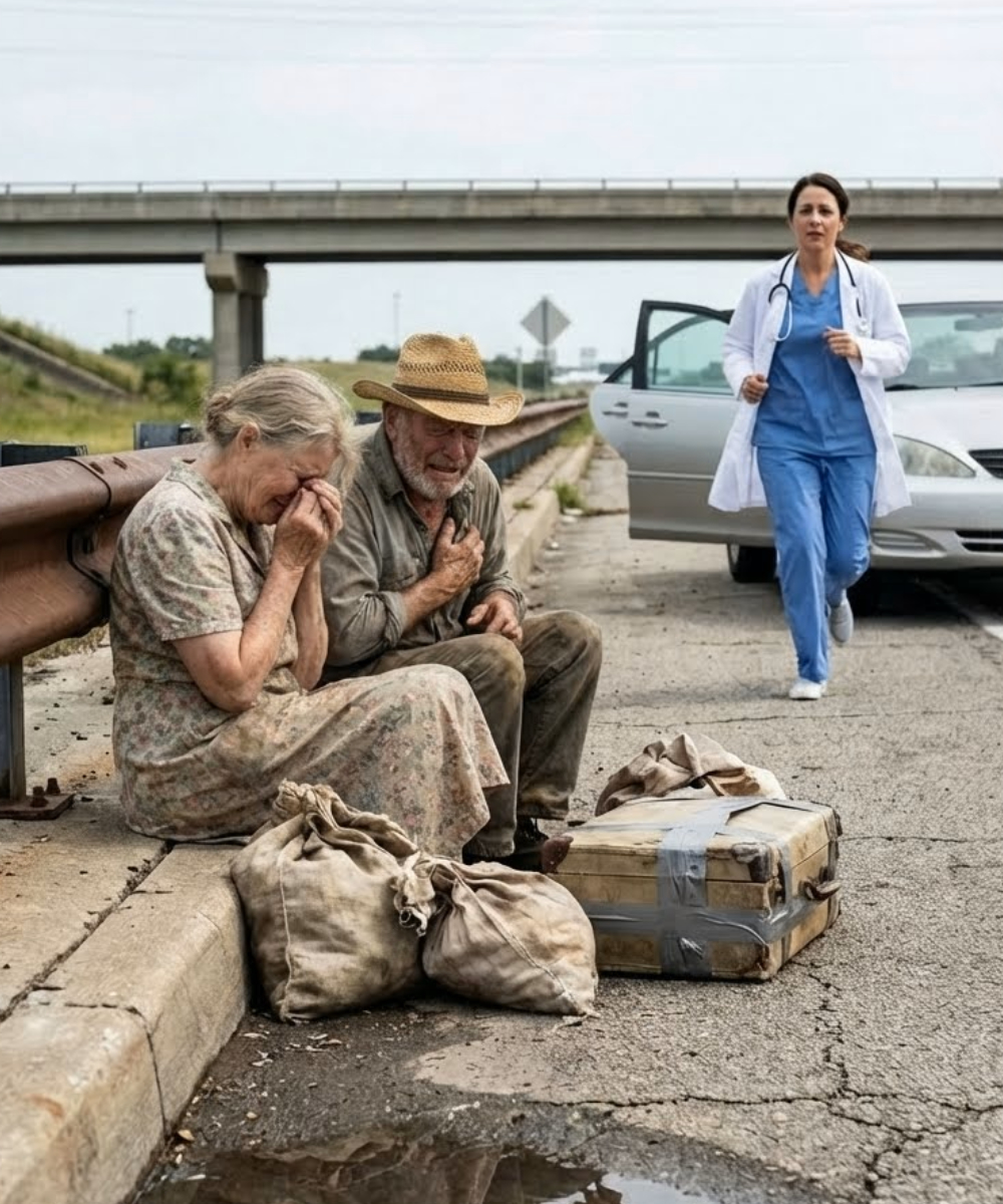 Two frail figures sat at the roadside beside battered suitcases. Their bodies were folded inward, shoulders slumped as if the weight of the world had finally pressed them down. Something in Corinne’s chest tightened. She slowed without thinking and pulled over.